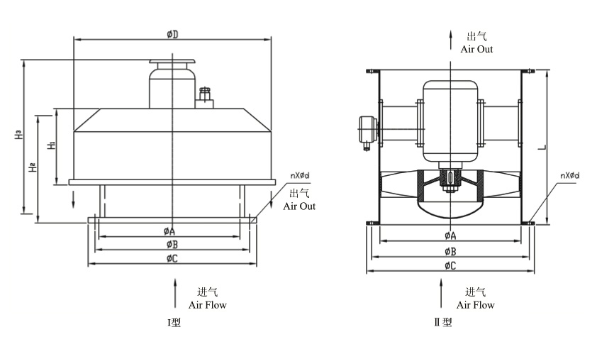 Type II explosion-proof ventilator has no wind cap. The explosion-proof motor is built-in, with stationary blade supports fixed on the casing. It can be installed vertically or horizontally, or on the deck, and can be used for both air extraction and supply.